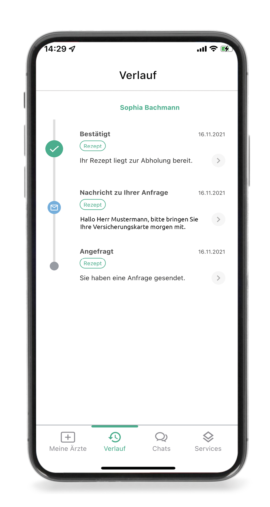 So können Sie jederzeit bereits gestellte Anfragen einsehen und bspw. für ein Folgerezept leicht eine neue Anfrage auslösen. Einfach antippen und nochmal bestellen.
